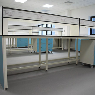 As you can see from the end result option 3 was chosen and we think it the colour and edging gives all the labs a clean and fresh look. The benching is white solid grade laminate on the cantilever support system as mentioned, as it gives free movement for the double units. The double units chosen were a mixture of double cupboard units, and double drawer units as shown below. We also installed double wall units, in the first floor lab, in the same colour.