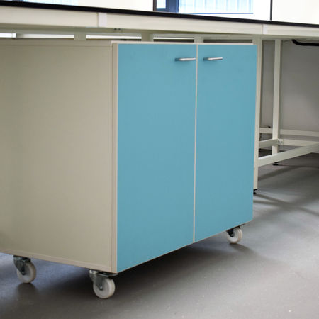 Medtech first enquired regarding their lab space back in October 2020. They explained it was to be a new build facility and would like assistance with designing their new laboratories. Our design team created a preliminary design using CAD drawings to assist. The initial design was based on cantilevers and mobile units to allow free movement of the Underbench units. The client liked this idea but wished to add some reagent shelving on the benching to enable power on the benching as well as storage space.Worktops are in White.Unit colours Blue 014 with white edging.
